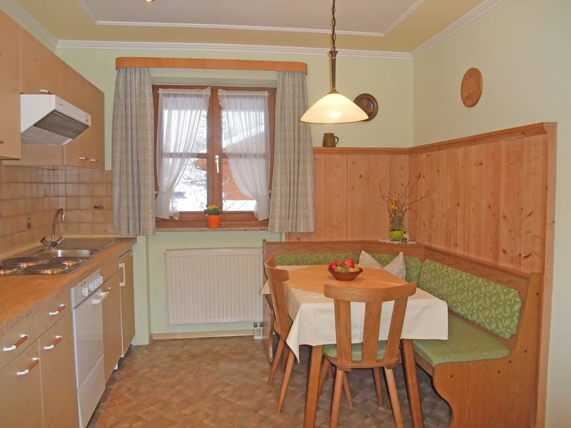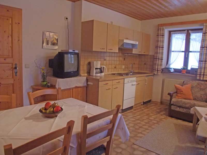 Die ruhigen Ferienwohunungen im 1. Obergeschoß haben jeweils eine voll ausgestattete Wohnküche mit Küchenzeile